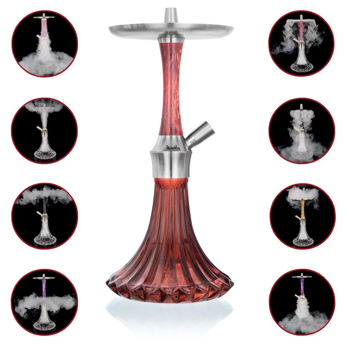 Aladin EPOX 360 Red Vino Pattern – tai kompaktiškas, 36 cm aukščio premium kaljanas, pagamintas iš nerūdijančio plieno, epoksidinio apvalkalo ir masyvaus stiklo. Šis modelis suteikia galimybę mėgautis net 9 skirtingais blow-off efektais, kurie leidžia individualizuoti oro išleidimo kryptį ir sukurti išskirtinį vizualinį efektą.